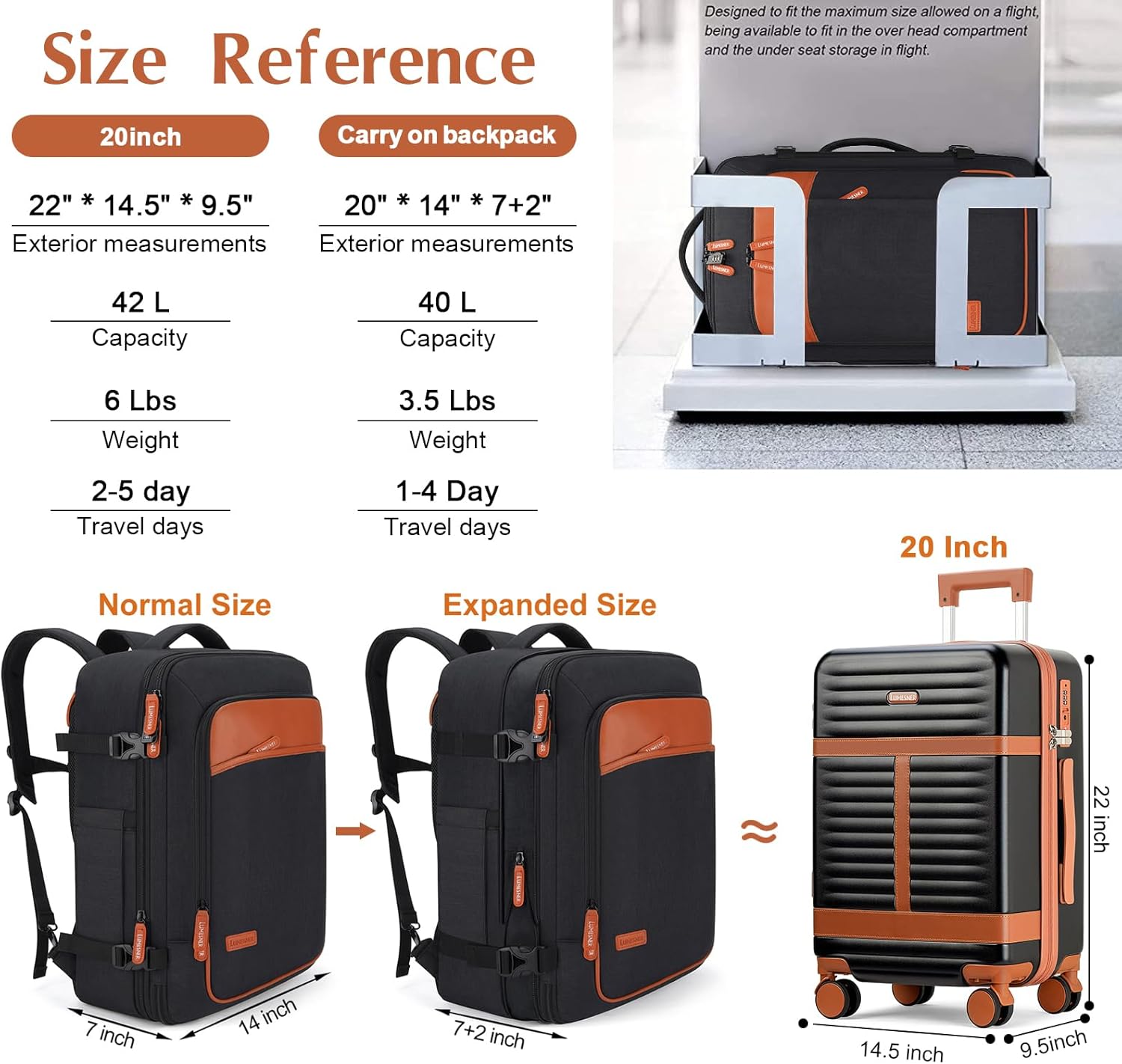 - βοΈ Airline Approved for Overhead & Underseat Storage:The suitcase meets most major airlinesβ overhead bin standards, while the backpack fits under seat. TSA-friendly laptop compartment makes airport checks faster and easier.